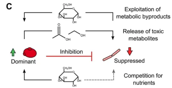 例如:S. boulardi 可能受益于L. reuteri 菌株产生的糖,同时 L. reuteri 可能会受到 S. boulardi菌株生长代谢的伤害。