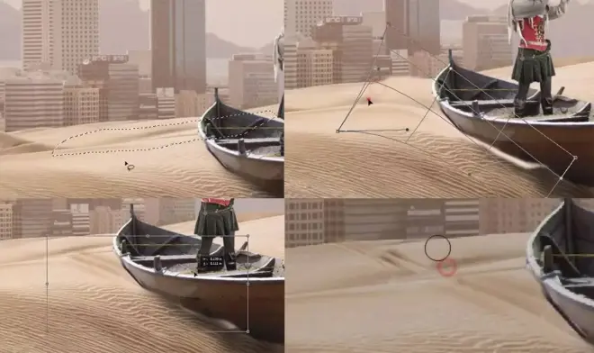 用套索工具圈出沙漠的局部,然后将其变形贴合船底,复制一层形成一小段轨迹,再将这小段轨迹复制一层向后移,再用橡皮擦擦除交接的地方,使轨迹更加真实。