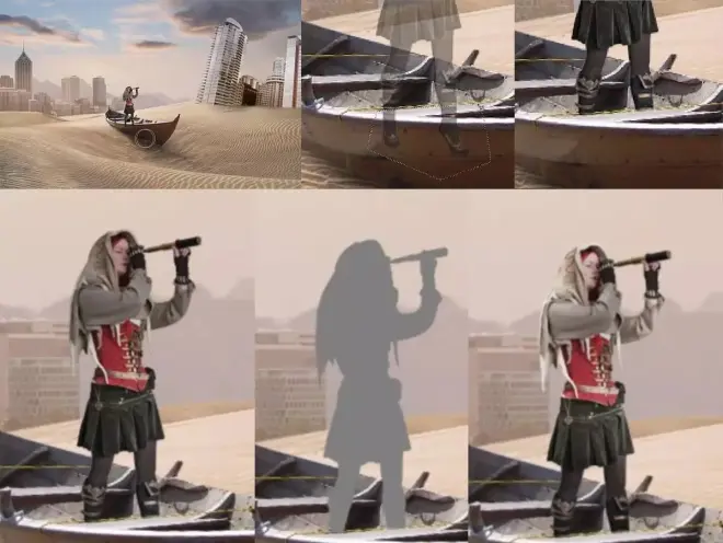 将人物素材中的人抠出,拖入画面中,放置在船上,将人物的脚部擦掉。在人物层上方置入中性灰图层(图层模式为叠加)结合“减淡”工具提亮人物亮部,加大人物本身明暗对比。