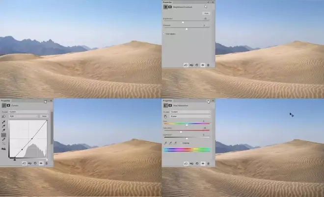 将有山的天空素材拖入画面中,放置在沙漠层下方,调整到合适的大小和位置,新建“亮度/对比度”(亮度值:-25)通道将天空压暗一点。在沙漠层上方置入“曲线通道”压暗沙漠,置入“色相/饱和度”(饱和度值:-26)降低沙漠颜色的饱和度。