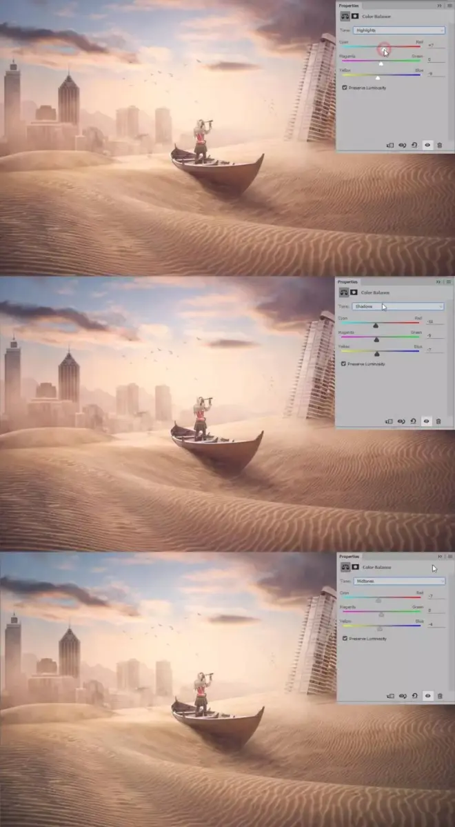 新建“色彩平衡”通道调颜色的高光、阴影、中间调的颜色。