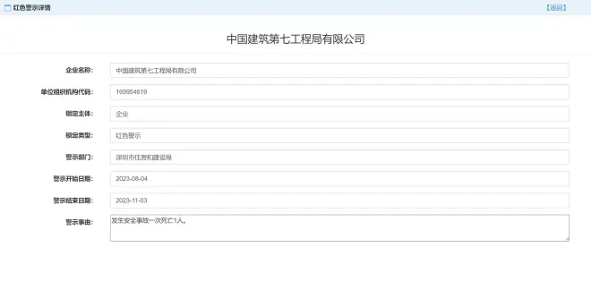 红色警示详情显示,中国建筑第七工程局有限公司,锁定类型:红色警示。警示部门:深圳市住房和建设局。警示开始日期:2023-08-04。警示结束日期:2023-11-03。警示事由:发生安全事故一次死亡1人。