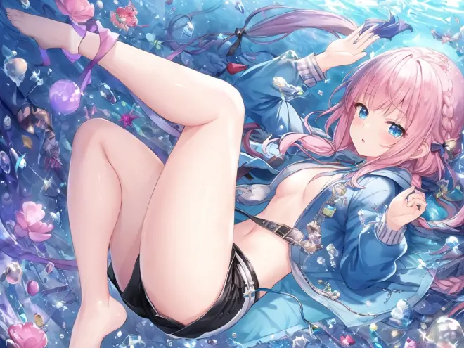 1girl, blue eyes, solo, bare legs, pink hair, blue jacket, white shirt, fetal position, twin braids, french braid, elite ii (arknights),hood, looking at viewer, underwater, long sleeves, bangs, suspenders, black shorts, hooded jacket, parted lips, open jacket, open clothes, water, short shorts, air bubble, suspender shorts, bubble, small breasts, thighs, blush, full body,