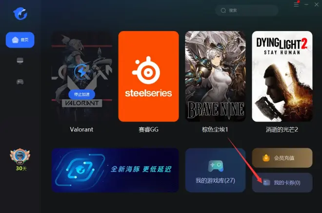 返回海豚加速器加速页面,点击我的卡券,输入【Valorant】即可直接领取亚服账号+72小时时长(游戏的匹配是根据账号区域来分配大洲服务器,游戏内可以自已选择要匹配的具体服务器)