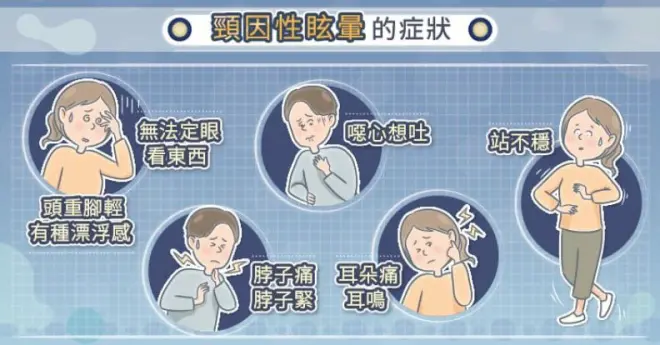 在出现头晕感的时候,患者会恶心想吐,无论走路、站着、或坐着都觉得不稳,失去协调,有平衡困难,无法保持直立的姿势。最特别的是,同时伴随着脖子痛与脖子紧的不适。
