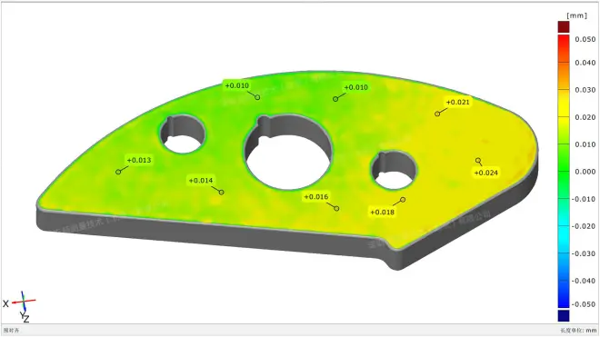 将获取数据导入三维检测软件中与原始CAD数模进行对比分析,生成简单易懂的偏差色谱图,为后续产品的修模、改模提供精准的数据指导。