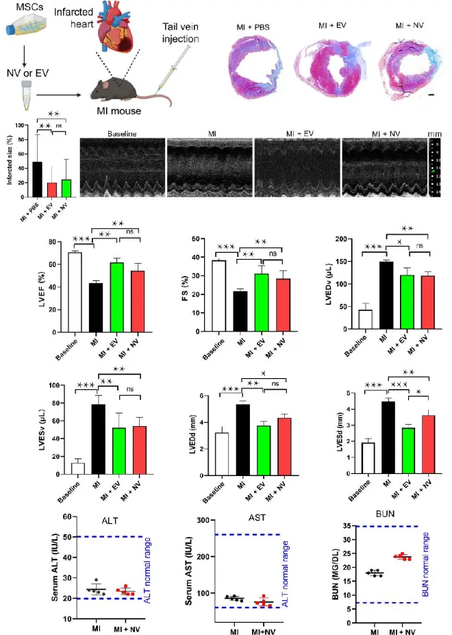 用心肌梗死小鼠模型验证NVs的治疗效果,结果显示治疗28d后,梗塞面积显著缩小,心功能改善。对NVs治疗的安全性进行验证,结果显示NVs治疗未显示出肝或肾功能损害。