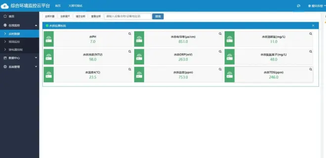 1.实时数据在线监测,用户可以在环境监控云平台中查看所有监测要素的实时数据,设备名称、设备地址、报警类型、标记位置、离线判断间隔、保存数据间隔、在线/离线设备数量。