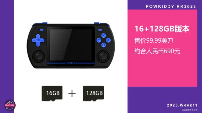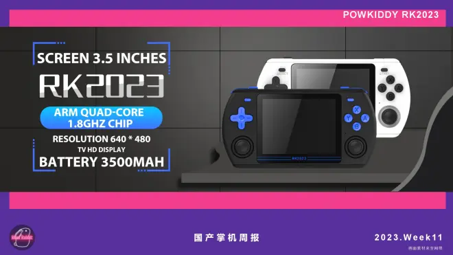 3月13日0点,霸王小子powkiddy正式发布了其2023年第一款新品:RK2023。 RK2023的SOC采用瑞芯微RK3566,其机能可以畅玩PS1、N64、NDS及以下平台,可以游玩部分PSP游戏(与友商的RG353系列产品和MINI PLUS系列产品为同一水平)。 目前已针对海外进行销售,16+64GB版本售价为89.99美刀,约合人民币620元。16+128GB版本售价为99.99美刀,约合人民币690元。国内则将于近日上架电商平台,具体售价未知。