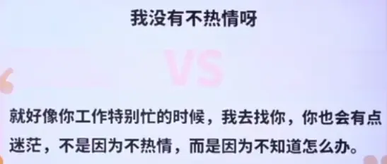 情绪沟通:当两者发生矛盾,发生情绪冲突的时候,我们要怎么去识别她的情绪,怎么说出他的情绪怎么样扩充自己的情绪词汇?情绪识别很重要,而且不只有喜怒哀乐四种情绪,只局限于这四种情绪可能会造成情绪错位,然后会在解释上浪费时间消耗情绪,最终可能又造成另一个情绪错位。
