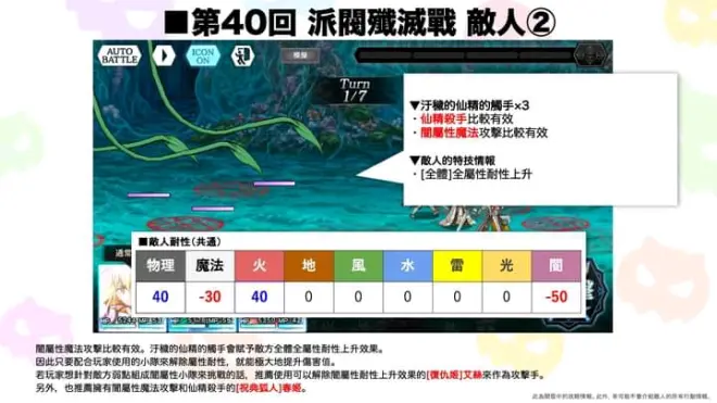 快速發動。5回合內我方全體力量、魔力、靈巧、物理及魔法耐性上升40%、賦予40%HP治癒效果。1回合內自身回復量上升60%。賦予自身3次"全體強威力超高機率穿透暗屬魔攻。我方全體HP回復40%。3回合內我方全體全屬性傷害上升50%、敵方全體魔法耐性減少40%"追加行動。