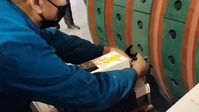4.滚筒以 0.3米/秒速度慢速转动,缓慢摇动进给手柄,保证每次进刀滚筒运行一周。进 刀量控制:刚开始车削时,车刀未完全受力,进给量为0.2-0.4mm;车刀完全接触到衬垫时进给量为0.1-0.2mm。
