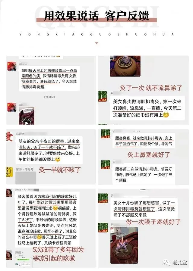 客户案例2:客户多年老鼻炎,每逢季节交替就流鼻涕、打喷嚏不止,经过老艾堂2次清肺排毒灸后,鼻炎问题明显减轻,早起还排出很多肺部浊物,感觉轻松了很多。客户果断充了清肺排毒灸疗程卡,坚持按疗程调理,没想到多年的老鼻炎到换季时竟然再也没有犯了!