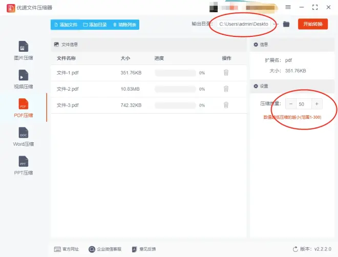 步骤3、文件上传完成后,在右侧进行设置,当压缩值设置越低,PDF文件被压缩得越小。我们还可以在顶部设置“输出目录”,压缩后的文件就保存在那里。