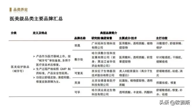3)医美级护肤品(械字号为主):品牌方多有医疗器械生产背景,产品多作为医疗器械上市,按“械字号”审批备案(近年开始增加“妆字号”产品),多用于医疗美容术后修复,也称为“医用敷料”、“医用敷贴”;产品生产过程严格依照 GMP 制药标准,安全性较高,功效多以补水修护、舒缓皮肤、清痘抑菌为主,且刺激性较弱;典型品牌有:芙清、敷尔佳、可复美、创福康、绽妍等。