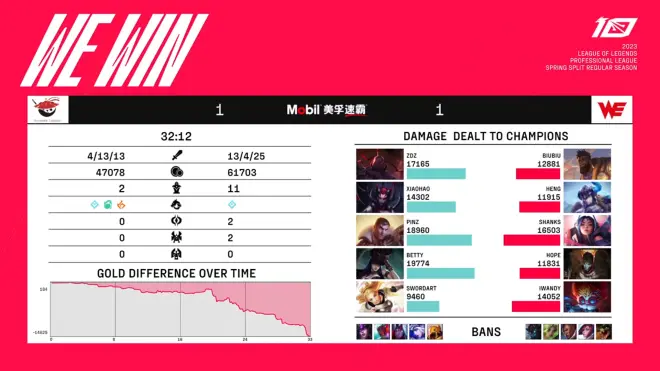 被翻盘的WE,在第二局比赛中依旧选择重拳出击,而AL则依旧选择反打的战术。可惜的是,这一次却是WE笑到了最后,他们在比赛前期,就出近2K的经济优势,尽管AL拿下了前两条小龙,但无济于事,WE以一路领先的姿态,在32分12秒,扳回一城,双方战至1比1平局。