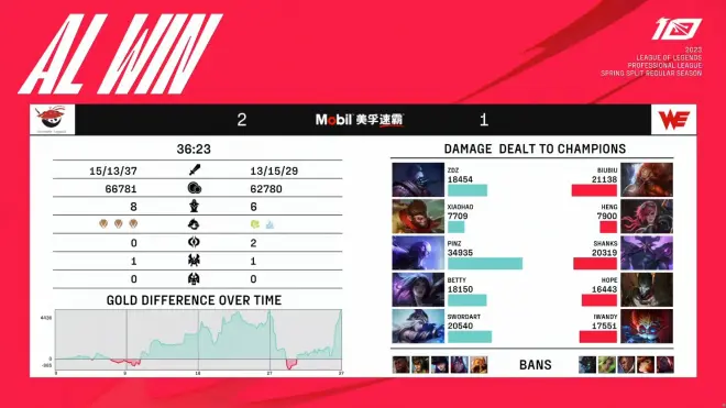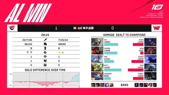 进入决胜局后,WE和AL都拿出了真本事,双方在比赛中打出了多次反抓。在这一局比赛中,我们不难发现,AL对于胜利的渴望是多么强烈。以至于他们在领先了近5K的情况下,求胜心切,在27分钟左右,被WE抓住机会,打出了一波0换3,并斩获大龙,直接将经济反超。不过好在经济反超后的WE,也犯了求胜心切,操作失误的情况,36分23秒,AL在大龙坑强行开团,随后AL打出1换5后,终获首胜!