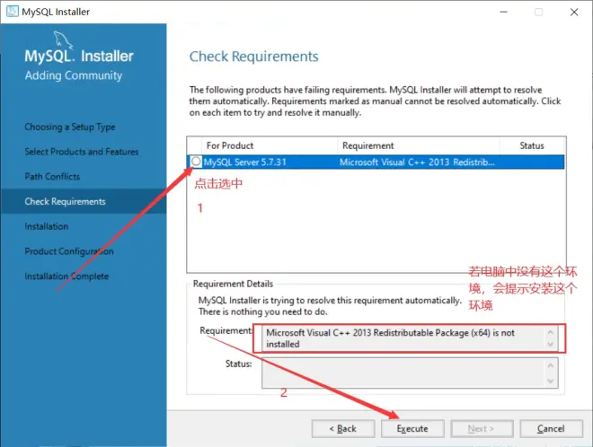 9. 先选中“MySQL Server5.7.31”,若电脑中没有这个环境,会提示安装“Microsoft Visual C++ 2013”环境,点击“Execute”