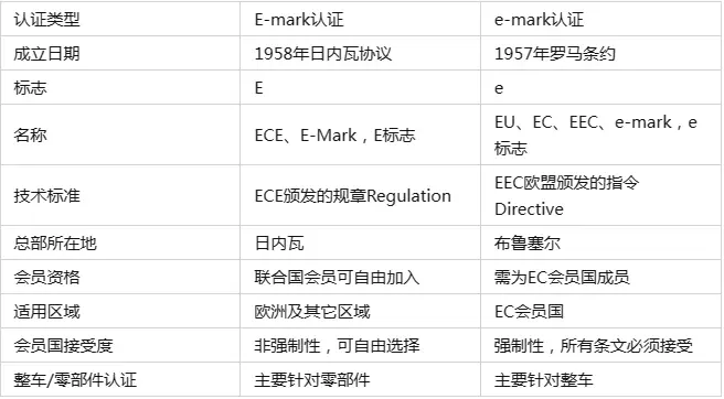 所有进入欧洲的整车,关键零部件及系统都应该得到欧洲相关交通部的许可批准,也就是目前所谓的E/e-Mark认证,具体体现为E标志和e标志认证。
