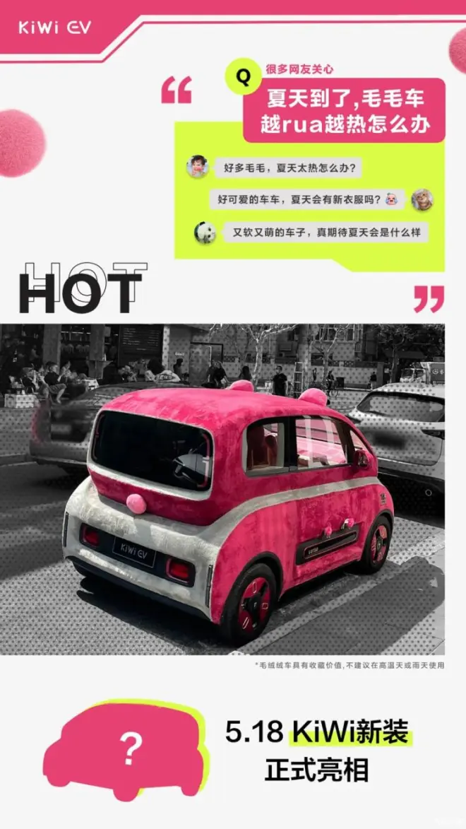 之前,宝骏KiWi EV与草莓熊跨界联手推出的草莓熊版已经震撼大众,最新消息,采用全新毛茸茸涂装的宝骏KiWi EV车型将于5月18日正式亮相。根据图片中附带的建议,毛绒绒车具有收藏价值,不建议在高温天或者雨天使用,这不就是一台大车模?作为交通工具而不能在高温天或阴雨天开出门,收藏价值大于实用价值,老实人大呼不李姐。