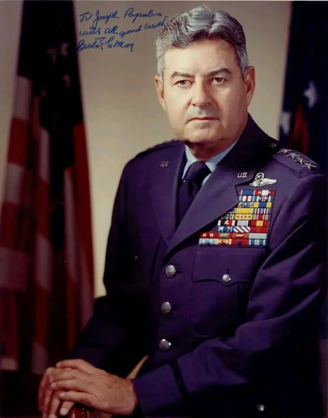 (三)美军在1945年2月23日至24日首次对东京采取大规模燃烧弹轰炸,当晚174架B-29轰炸机在东京抛下大量凝固汽油弹,把东京约2.56平方千米的建筑焚毁,这更加坚定李梅实施大规模夜间火攻的决心。重新评估局势后李梅想出一个重大战术变化,他决定在以后的任务中拆除轰炸机上所有的枪炮炮塔以及弹药 ,只留下飞机尾部的机枪手,以减轻B-29的重量并携带更多的燃烧弹。在5000-6000英尺的低空开展夜间轰炸,引发大火来震撼日本国民,并破坏散布在居民区的生产零部件和预制件的小作坊,以达到彻底瘫痪日本军事工业的目的。为避免不必要的伤亡,空袭时各轰炸机单独轰炸,而不进行编队。由前面的轰炸引导机首先投弹,引入目标区,该计划使已经习惯安全高空投弹方式的轰炸机组人员疑虑重重。李梅做出上述战术变化的原因是发现日军夜间防空装备不足,而且李梅决定延后将计划呈送华盛顿的时间,由自己承担这次作战任务的全部责任。1945年3月9日夜间334架B-29从马利亚纳群岛的关岛出发直扑东京,每架飞机携带六至八吨燃烧弹,燃烧面积可达6500平方米。 (四)24时15分两架导航机到达东京上空,在预定目标区下町地区投下照明弹,接着投下燃烧弹,为后续飞机指示目标。随后大批轰炸机以单机飞行依次进入目标区域投掷燃烧弹,火势迅速蔓延。轰炸持续2小时,共投下2000余吨燃烧弹。空袭中有9架B-29被击落,5架负重伤并在海面迫降,42架受伤,其余轰炸机安全返回基地。轰炸造成的大火形成的灼热气浪与冷空气形成强劲对流风,从而形成火旋风,其产生的高温足以使市区内所有可燃物(包括人体)烧着。轰炸使日本皇宫以东地区近41平方千米的建筑被焚毁,约为东京面积的四分之一,其中18%是工业区,63%是商业区,其余是住宅区。计划中的22个工业目标全部被摧毁,26.7万多幢建筑付之一炬,8,3793人被烧死,10万人被烧成重伤,100万人无家可归。火攻东京后不到30小时317架B-29轰炸机又夜袭名古屋,使该市的飞机制造中心化成一片火海。3月13日日本第二大城市大阪也遭到300架B-29的轰炸,1700吨燃烧弹倾泻而下,20.7平方千米的市区在3小时内被焚毁。3月16日美军又轰炸神户,将其造船中心摧毁,美军于四、五、六月又大举空袭日本其它各大中小城市。