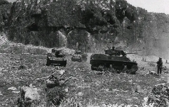 (二)第五十联队原是驻扎在中国东北的关东军,训练有素,装备精良,是岛上防御的中坚力量。岛上军衔最高的是第一航空舰队司令角田觉治海军中将,但他所属的部队是岸基航空兵,而且已在战斗中几乎损失殆尽,所以实际指挥地面战斗的是五十联队联队长绪方敬志大佐。美军在6月11日进攻塞班岛开始后始终分派部分飞机、军舰对提尼安岛进行火力压制,并吸取塞班岛登陆的经验教训大力加强炮火准备。6月20日起美军就将第二十四野战炮兵军的200门155毫米火炮部署在塞班岛西南海岸,对提尼安岛北部地区进行炮击,在十五天中发射的炮弹多达2,4536发,平均每分钟就落弹一发。与此同时美军侦察机和水下爆破队对提尼安岛进行周密系统的侦察,发现提尼安岛地形不像塞班岛那么复杂,比较平坦。但其海滩多是由珊瑚礁组成的悬崖峭壁,适合登陆的滩头只有西南部的桑哈隆湾和东部的阿西加湾。然而日军在这两处滩头布设有大量水雷,海滩上密布铁丝网,防御工事比较坚固。除了上述两处滩头外美军还发现在西北部有两处适合登陆的地点,缺点就是滩头宽度太窄,美军代号“白一滩”的滩头宽度仅30余米,代号“白二滩”的滩头也不过50米宽。 (三)日军在此的防御非常薄弱,近乎是不设防的。特纳与史密斯商议后认为这里可以得到塞班岛地面炮兵的有力支援,而且出乎日军的意料,能够出其不意。最终决定在这两个滩头实施登陆,以达成进攻的突然性。但如何在这样狭窄的滩头将两个师的人员、车辆、物资运上岸还从来没有过,好在美军已经通过几年来的战争逐步学会战争,能够在复杂情况下应付自如。7月22日美军首次出动P—47战斗攻击机使用凝固汽油弹攻击提尼安岛,7月23日美军将提尼安岛划分为五个区域,投入舰载机、岸基航空兵、舰炮和地面炮火,进行全面火力准备,使日军火炮阵地和防御工事遭到了严重破坏。美军在炮火准备中故意对桑哈隆湾和阿西加湾进行猛烈轰击,而对预定登陆的西北部地区轰击很轻微,以迷惑日军。绪方将其主力调到上述两个滩头,但他还是留了一手,命令各地部队必须将三分之二的兵力作为机动兵力,随时准备调往其他地区,以应付突发情况。当天夜间美军陆战二师两个团在桑哈隆湾和阿西加湾实施佯动登陆,当日军开始还击后就重新登上运输舰,前往真正的登陆地点。 (四)陆战四师则由37艘坦克登陆舰运载,在西北海滩实施登陆。美军乘坐履带登陆车分为15个波次,以很小间隔向滩头冲击。7时50分第一波抢滩登陆中履带登陆车卸下登陆兵立即调头,运载后续部队,尽管每一波只相距四分钟,但美军没有一点混乱且秩序井然,日军抵抗极其轻微。8时20分已有三个营上岸,10时30分推土机上岸,迅速拓宽滩头,改善滩头狭窄的不利局面。11时30分第一批M—4坦克上岸,13时15分75毫米榴弹炮运上岸,随即在预定位置就位,开始以炮火支援登陆部队的推进。黄昏时分塞班岛运来的两个浮桥码头开始架设,于次日早晨开始发挥作用,满载人员和物资的车辆可以从浮桥码头直接开上岸,大大提高卸载的速度和效率。17时45分陆战四师全部上岸,18时50分75毫米半履带式自行火炮也开始上岸,20时佯动登陆的陆战二师先头营也已登上滩头。日终时美军已有1,5614人上岸,并形成巩固的登陆场。7月25日凌晨绪方投入2个步兵大队和12辆坦克发动反击,总共向美军发起三次冲锋,在美军猛烈炮火下阵亡达到1200人,但日军的进攻一直持续到天亮才告平息。这次反击伤亡的都是提尼安岛上最具战斗力的第五十联队的精锐部队,惨重伤亡使日军的防御力量遭到极大削弱,此后日军就再也没有实施有组织的反击。