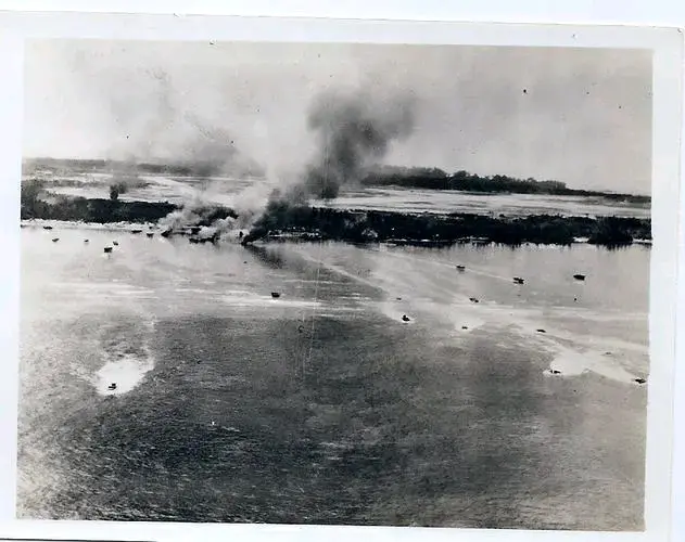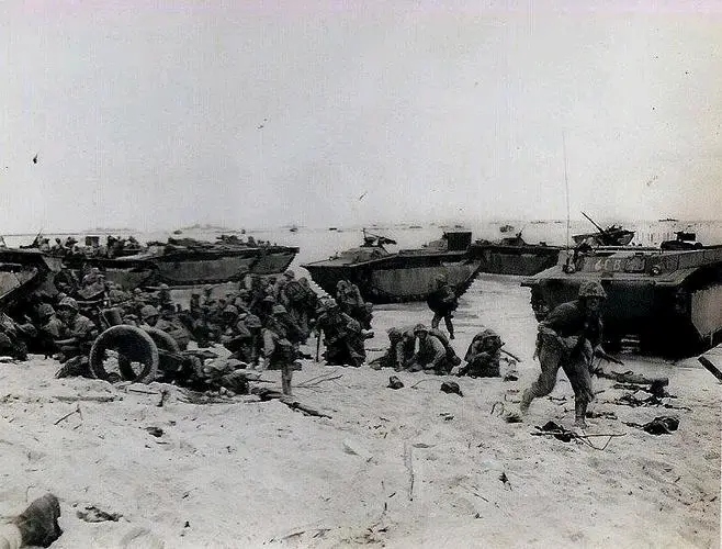 (十三)当美军炮火向岛纵深延伸时日军第14师团步兵第2联队的士兵立即通过壕沟与坑道进入滩头阵地与暗堡,准备迎接美军的登陆大军。日军这些训练有素的士兵非常沉的住气,在没有接到开火命令时无一人擅自开枪射击。当美军登陆艇与两栖装甲车以密集队形开到距离沙滩不到300米距离时几艘登陆艇与两栖装甲车触响日军布在浅水里的飘雷,当场人艇粉碎。美军登陆艇立即散开停下,并用机枪向海面可疑漂浮物扫射,并成功射爆几个水雷。随后美军登陆艇与两栖装甲车继续前进,日军仍然一枪不放,这使得美军更加确信日军早死光。美军登上沙滩后又在沙滩上前进20米,一直冲到距离日军防波堤30米距离时防波堤上的日军暗藏火力点才突然同时开火。当时美军毫无防范,立即就被击倒一大片,随后日军的掷弹筒、直瞄炮、迫击炮,手榴弹就铺天盖地打过来。美军在如此近的距离遭到突然射击时顿时乱作一团,完全成了活靶子。在这样近的距离遭到突然袭击任何躲闪都是无效的,走在前面的几百名美军当场被日军全部杀伤在沙滩上。后续登上沙滩的美军也毫无思想准备,被日军杀死在滩头,上陆的两栖装甲车也被日军直瞄炮一辆辆的击毁在岸边。日军隐藏在岸边的火力点距离海岸仅仅50米远,这样近的距离日军命中率很高。 (十四)沙滩上的美军很快被日军射杀完毕,而搭乘登陆艇的后续部队因前方布满登陆艇与两栖装甲车的残骸根本无法靠岸,只好在海上另找登陆地点。由于距离日军过近,登陆艇上的美军士兵遭到日军准确枪击伤亡严重,一批美军登陆艇在原登陆地点以西300米靠岸,所载陆战队员还未上岸就有大半已经阵亡和受伤。而美军负担登陆掩护的舰艇对这个没办法,无法开炮压制日军火力点,因为日军与美军距离太近了,这次登陆完全成了屠杀。日军在非常隐蔽的火力点里从容不迫的瞄准每一个还能动的美军进行点射,美军连还击都不知道朝什么地方射击。美军第一波登陆的2个营有接近一半的士兵没能登上滩头,登上滩头的士兵大部分被日军打死或负伤,最后只得下令撤退。美军第1波登陆就这样以失败结束,参加登陆的部队有超过50%的人员负伤或阵亡,超过1000名美军陆战队士兵阵亡、失踪或负伤,60艘登陆艇、26辆两栖装甲车、3辆坦克被击毁。美军第一波登陆部队竟然被打下海,美国海军的水兵与军官非常震惊:贝里琉岛的日军遭到那么大强度的轰击竟还活着,而且还这么凶悍。