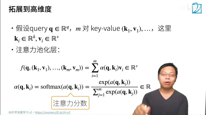 注意力池化层:将Query和数据集的Key-Value对输入,将q与k输入α函数,计算每个q与key的注意力权重,再与vi相乘,最后相加,最终得到的数据的结构是一个长度为v 的向量。