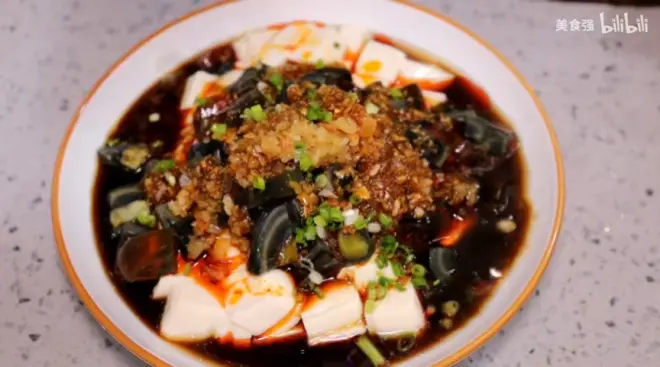 嫩豆腐、皮蛋、香菜、小葱、榨菜丁、香辣红油