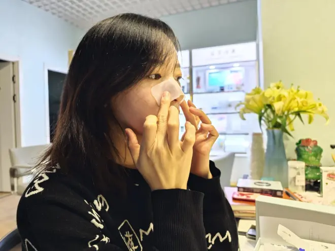 鼻头区域往往是黑头的重灾区,有些黑头比较多的人,可以用1号鼻贴,贴在鼻子上辅助热敷模式打开毛孔,导出黑头,这样也能让黑头祛除更加彻底一些。