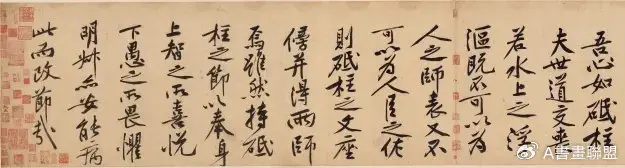 黄庭坚在上溯晋唐、学习前人经典书法时,对其影响最大的莫过于苏轼,可以说黄庭坚的手札小行书在很大程度上是学苏轼的。黄庭坚作为“苏门四学士”之一,深受苏轼书风的影响。在黄庭坚书论中,评东坡书颇多,且多为推崇备至者。苏东坡不仅是黄庭坚文学上的老师和提携者,而且也是其书法的学榜样。在黄庭坚题跋中,即反映出黄庭坚从苏轼处学习书法的一些消息,如“予与东坡俱学颜平原。
