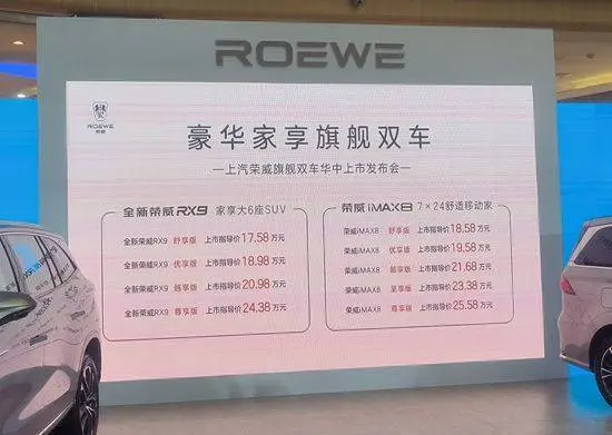 上市会现场,上汽荣威携全新荣威RX9与2023款荣威iMAX8两款车型,揭开了“2x3”与“7x24”两组“幸福方乘式”的答案。本次全新荣威RX9共推出5款车型,官方指导价17.58万元~24.38万元。2023款荣威iMAX8共推出4款车型,官方指导价18.58万元~25.58万元。