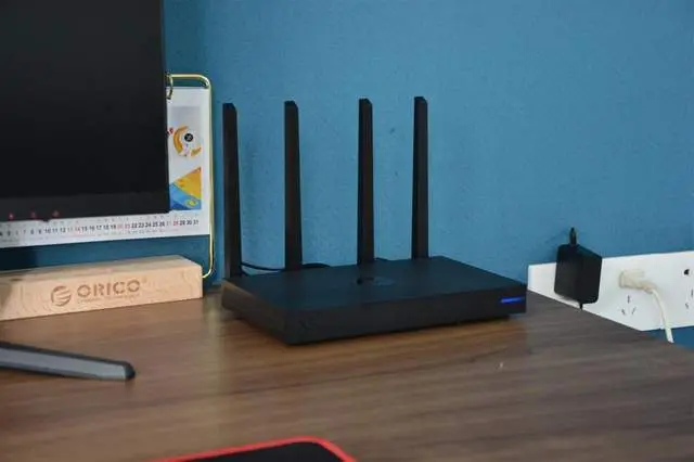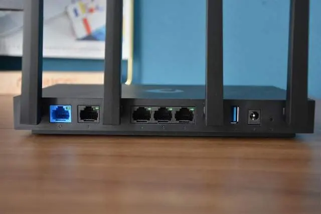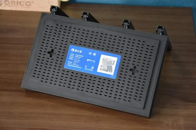 机身的后背,则并排设计了四根外置天线。然后在每两根天线中间依次安排了一个蓝色的WAN接口、四个LAN接口、一个USB3.0接口、电源接口、重置按钮。