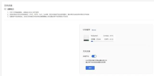 异地组网完成之后,接下来基本就可以实现远程办公了。首先利用贝锐蒲公英X5 WiFi6路由器机身上的USB3.0接口,连接一个硬盘,一定要注意打开文件的“共享开关”功能。如果想要保障文件共享之后的安全性,可设置访问权限。