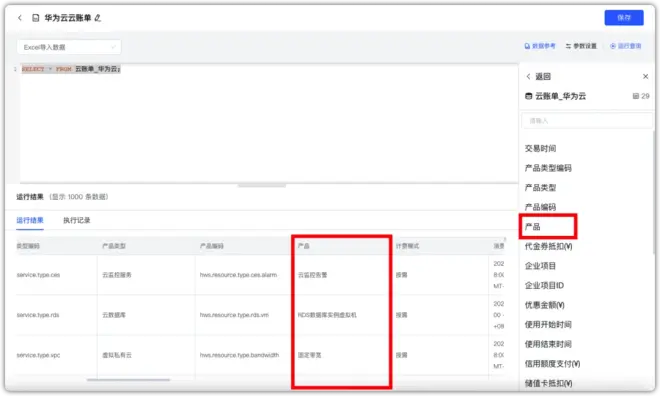 这部分我们通过一个示例来介绍。如下图所示,通过一个简单的SQL语句,我们查询了华为云的账单数据。