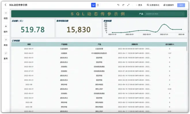当我们在仪表板上使用账单数据时,预备将产品作为筛选条件,并且希望该条件在SQL数据集中作为动态参数被传入。