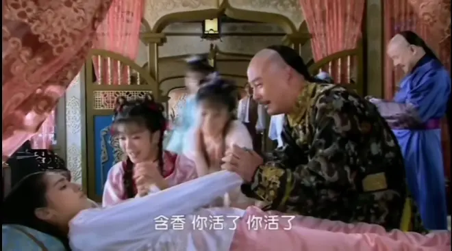 老版含香苏醒后,皇上最靠近床并配合台词“再给我一个机会重建你的幸福”接着通过接过肩头燕子的手,将燕子拉近床,让燕子成为最靠近床的人并配合台词“你都快把我们吓死了”通过演员扶肩、拉手的动作自然的改变了人物在画面中的占比,使得观众先看皇上再看燕子,让每个正在说台词的人都在镜头中凸显出来