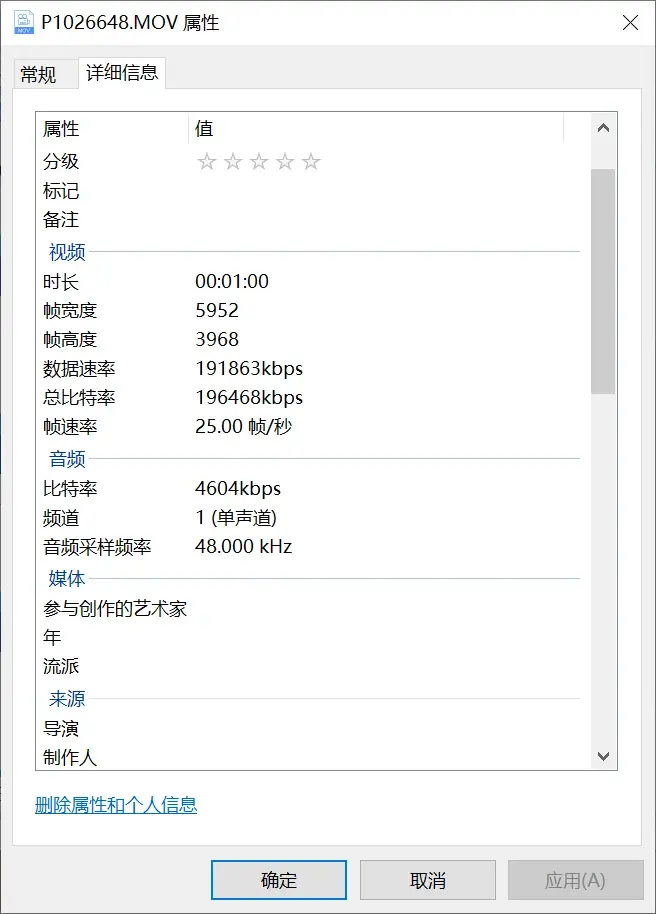 通过视频文件属性我们可以看到这段视频分辨率为5952*3968,帧率为25p,总码率可达196468kbps。