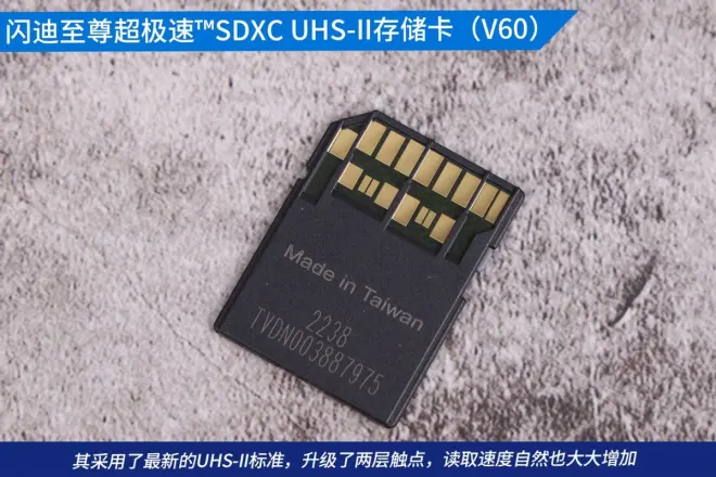 不过翻到背后我们发现,这张卡与之前的V30存储采用的UHS-I标准布局有所不同,其采用了最新的UHS-II标准,升级了两层触点,所以读取速度自然也大大增加了。