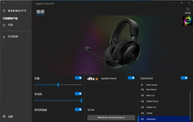 搭配驱动,通过 Microsoft Stone 微软商店下载 HyperX NGENUITY 匹配 Cloud III 飓风 3 功能管理,通过 USB 接口连接电脑,即可识别到已连接的产品,对应有给到产品的图片,功能调整左侧菜单是耳机及耳麦的音量调整,带有麦克风监视功能,DTS Headphone X 功能需自行选择开启,开启后另还有 EQ 功能可根据喜好自行选择。