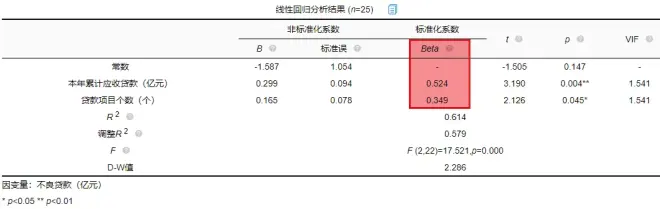 意味着“本年累积应收贷款(亿元)”和“贷款项目个数(个)”可以解释“不良贷款”61.4%变化原因。可见,模型拟合优度良好,说明被解释变量可以被模型大部分解释。接下来对模型结果进行解释。