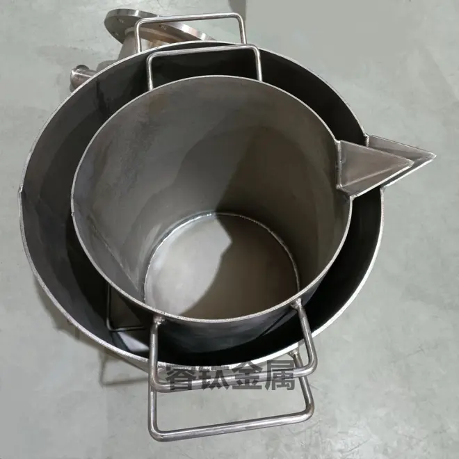钛桶或钛合金制作的桶型容器,包括钛桶、钛缸、钛盆、钛坩埚、钛电解桶、钛蒸发桶等耐高温强碱耐腐蚀熔金提取容器。一般用于盛装或加热腐蚀性强的液体,如强酸强碱强腐蚀剂 “王水”等。