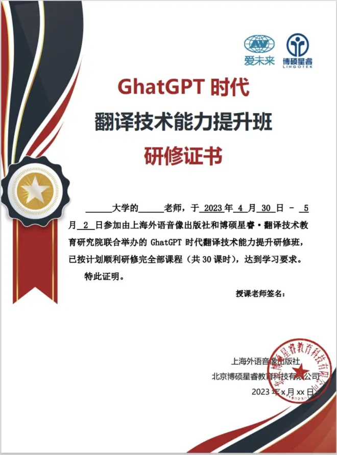 备注:本次研修班证书由上海外语音像出版社和博硕星睿教育科技有限公司联合盖章。