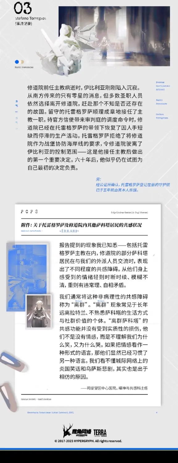 我们通常将这种非病理性的共感障碍称为“离群”。“离群”现象常见于长年远离拉特兰、不熟悉萨科塔的生活方式 与社群价值的个体。“离群萨科塔”的共感功能并没有受到实质性的损伤,他们不是没有情感,而是不理解我们为什么笑,又为什么哭。如果把情感看作一 种形式的语言,那他们显然已经习惯了另一种语言。我们看不懂城际网络上的炎国笑话和乌萨斯悲剧,其实也是出于相仿的原因。