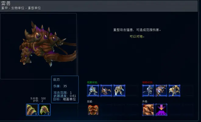 基础生命值500 初始护甲2 伤害35 射程1 攻速0.61 对地