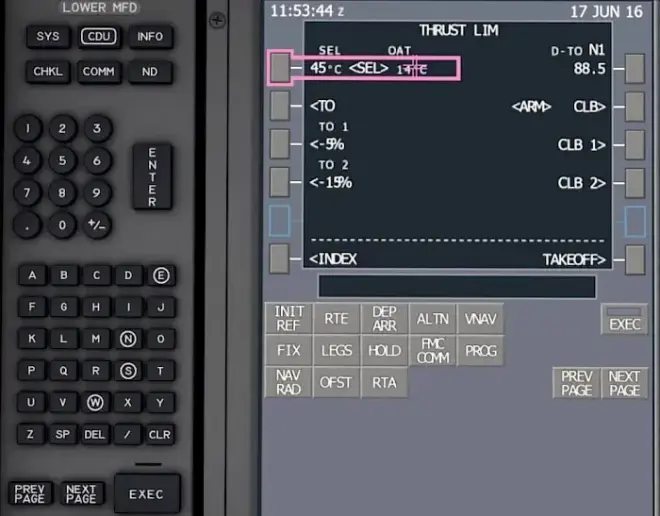 From the PERF INIT page select the THRUST LIM button in the lower right corner, or go to the INDEX and select THRUST LIM from there. On this page we have the option to select a reduced takeoff thrust. If runway length permits we can use less than maximum available takeoff thrust to reduce engine wear and noise during takeoff.