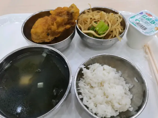 油炸鸡腿,凉拌菜,米饭,海带豆腐汤
