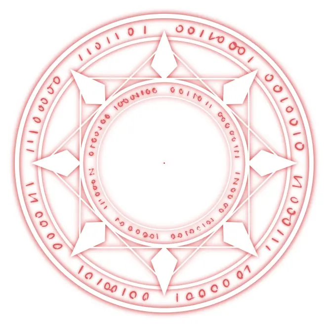 背后的法阵上写着的数字为0和1的组合,其中外圈为顺时针的波德码组成的I LOVE HUMAN,内圈为逆时针。
