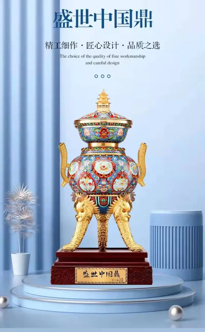《盛世中国鼎》以中华五千年文化“中国鼎”为原型。“鼎”在古代被视为立国重器,是国家和权力的象征。寓意“显赫”、“尊贵”、“鼎盛”等意义。《盛世中国鼎》宝鼎造型,高53厘米,三足方耳圆身,寓意,天圆地方,顶天立地;鼎身镶嵌60颗宝石并大面积鎏金、不惜工本、尽显尊荣;在铜胎上掐出十二生肖、上藏和平鸽、凤凰、祥云等吉祥图案,象征吉祥如意,国泰民安。通体掐丝,细密、纹饰华丽;色彩晶莹润泽、富丽华贵;外观庄重雄浑、霸气十足,承袭了皇家景泰蓝尊崇高贵的气派。