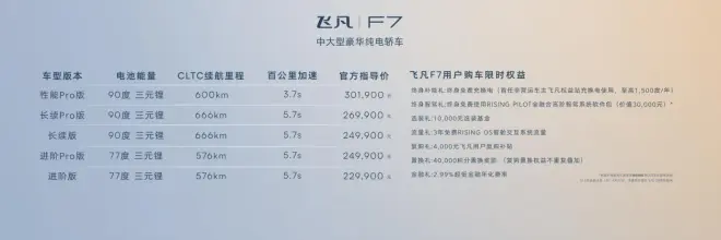 飞凡F7共推出六款车型,77kWh进阶版售价22.99万元,77kWh进阶Pro版售价24.99万元;90kWh长续版售价24.99万元,90kWh长续Pro版售价26.99万元;90kWh性能Pro版售价30.19万元。此外,为了让更多人享受飞凡F7的越级舒适体验,飞凡F7还将提供64kWh磷酸铁锂基础版,售价20.99万元,将于今年下半年上市。选择车电分离模式购车,飞凡F7购入门槛将进一步下探至14.59万元。